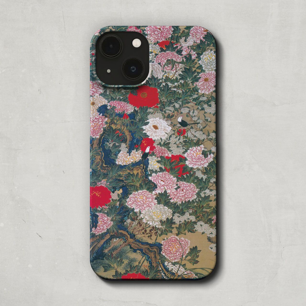 スマホケース / 伊藤 若冲「牡丹小禽図 (1761-1765頃)」 iPhone 全機種対応 14 13 12 11 SE Pro Max Plus mini ケース カバー 若冲 花 花柄 牡丹 ぼたん ボタン 小鳥 動物 アニマル 日本画 和風 和モダン 絵画 アート レトロ マット ペア 個性的 おもしろ | いきもの×アート雑貨 カイガラクラブ