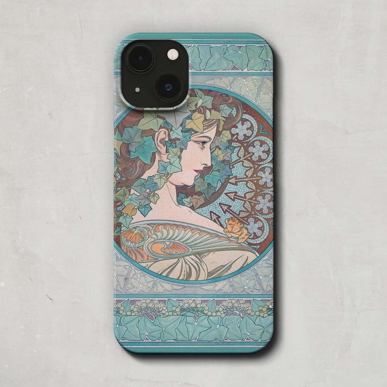 スマホケース / アルフォンス ミュシャ「蔦 (1901)」 iPhone 全機種対応 14 13 12 11 SE Pro Max Plus mini ケース カバー ミュシャ アール ヌーヴォー ツタ 葉 葉っぱ 花 植物 柄 ボタニカル 女性 名作 イラスト 絵画 アート レトロ マット ペア 個性的 おもしろ